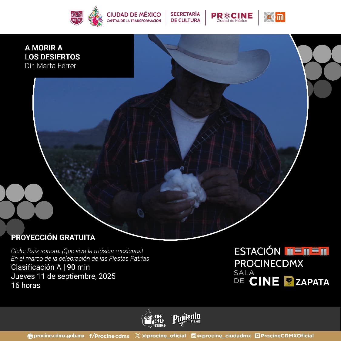 Para cerrar el ciclo, el jueves 11 de septiembre, a las 16 horas, se presenta A morir a los desiertos (México, 2017, 90 min) de Marta Ferrer. La cinta es un viaje al semidesierto de la Comarca Lagunera para buscar a los últimos maestros del Canto Cardenche, un canto melancólico que está en peligro de desaparecer.