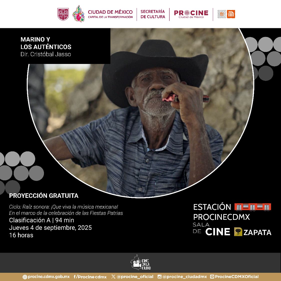 El ciclo inicia el jueves 4 de septiembre a las 16 horas con Marino y los auténticos (México, 2024, 94 min), ópera prima de Cristóbal Jasso. La película narra la historia de Marino, un músico y pescador analfabeta que ha compuesto más de 46 canciones y sueña con grabarlas para dejar un legado junto a su grupo.