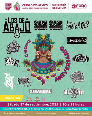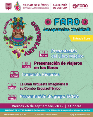 Ciudad de México.- La Fábrica de Artes y Oficios (FARO) Azcapotzalco Xochicalli, perteneciente a la Secretaría de Cultura de la Ciudad de México, celebra su séptimo aniversario bajo el concepto “Chicome Xochicalli: 7 años de oficios, artes y cultura”. Para esta ocasión, se ha preparado una jornada que incluye la participación de 12 agrupaciones musicales de géneros como ska, rap, cumbia, rock y huapangos, además de actividades infantiles, los días viernes 26 y sábado 27 de septiembre.