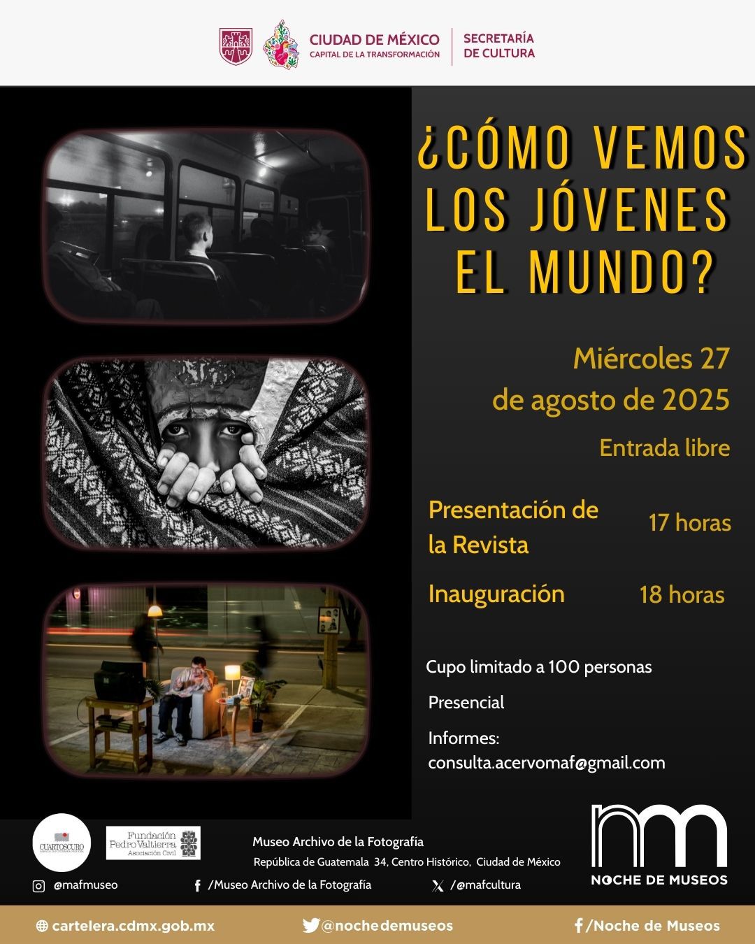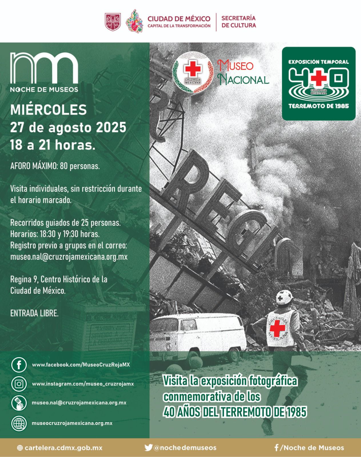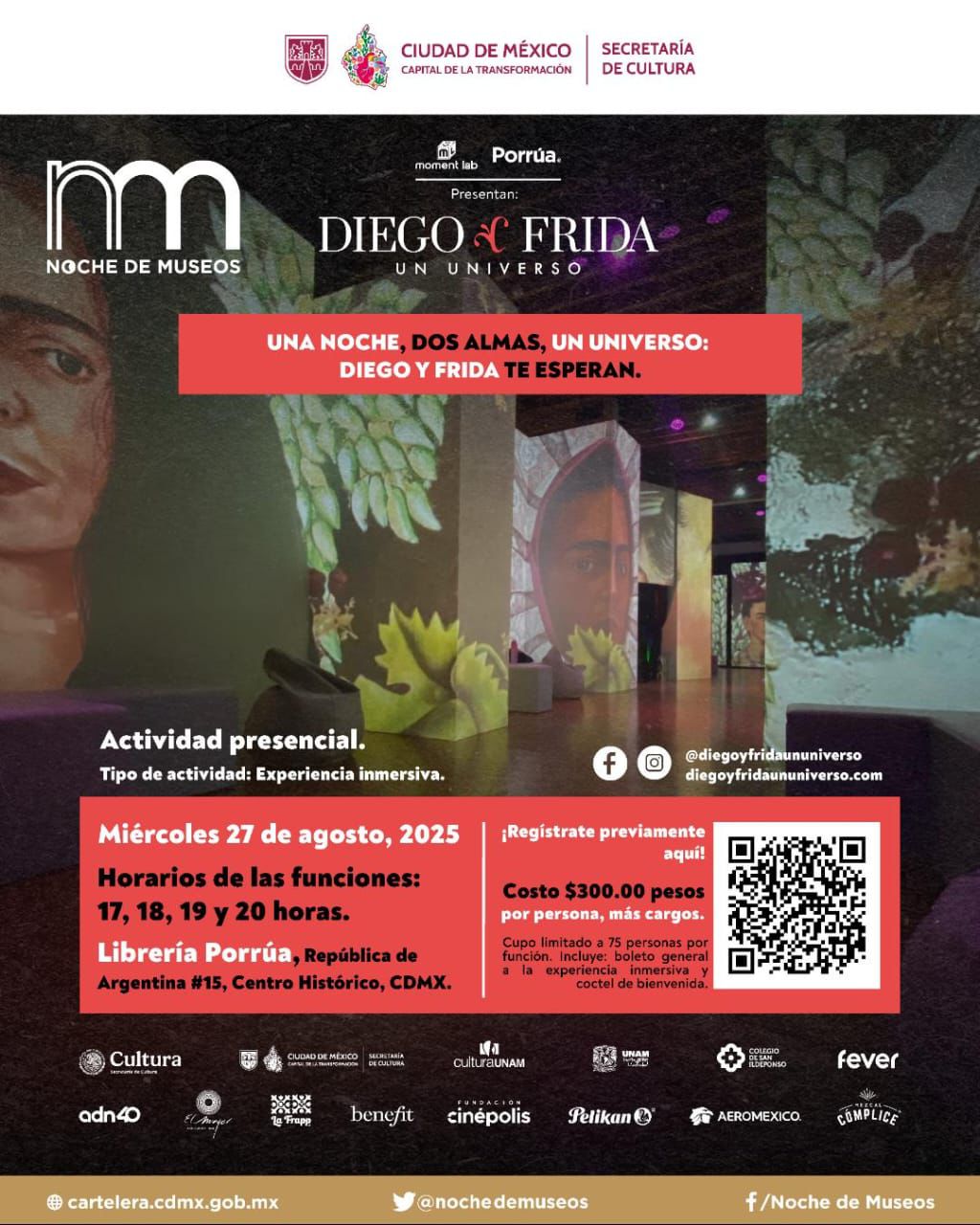 La gran novedad es el debut de “Diego y Frida: Un Universo CDMX”, montaje inmersivo de más de 300 imágenes, fotografías y proyecciones con funciones cada hora de 17:00 a 20:00 en Librería Porrúa (República de Argentina 15); acceso: $300. El Museo Nacional de la Cruz Roja Mexicana abordará el terremoto de 1985 de 18:00 a 21:00 con recorridos guiados (18:30 y 19:30); entrada libre con registro en museo.nal@cruzrojamexicana.org.mx. En el Museo Archivo de la Fotografía se presentará una revista a las 17:00 y se inaugura exposición colaborativa con jóvenes creadores; registro: consulta.acervomaf@gmail.com. El Salón de Cabildos abre a las 18:00 para relatar la historia del Antiguo Palacio del Ayuntamiento (entrada gratuita).