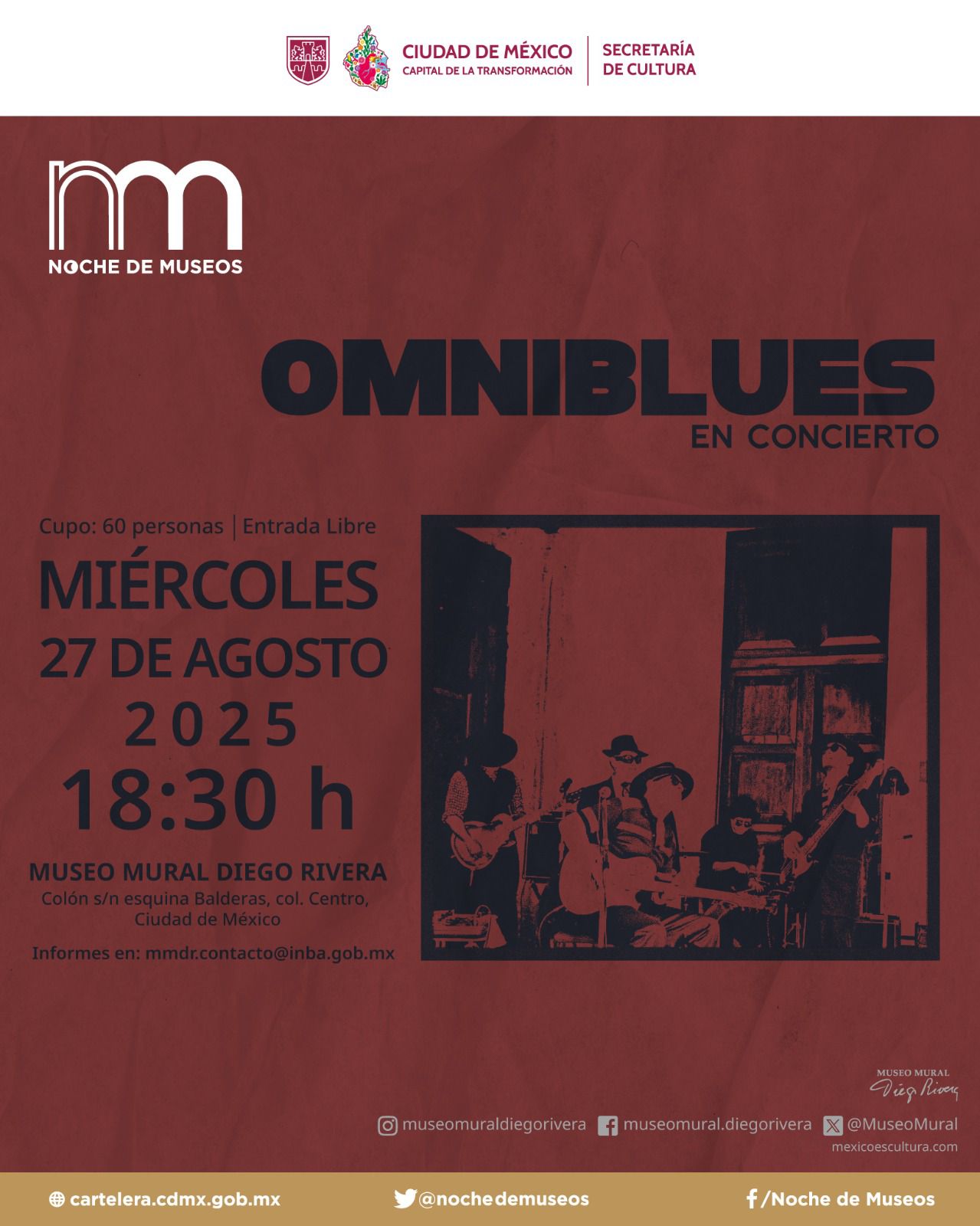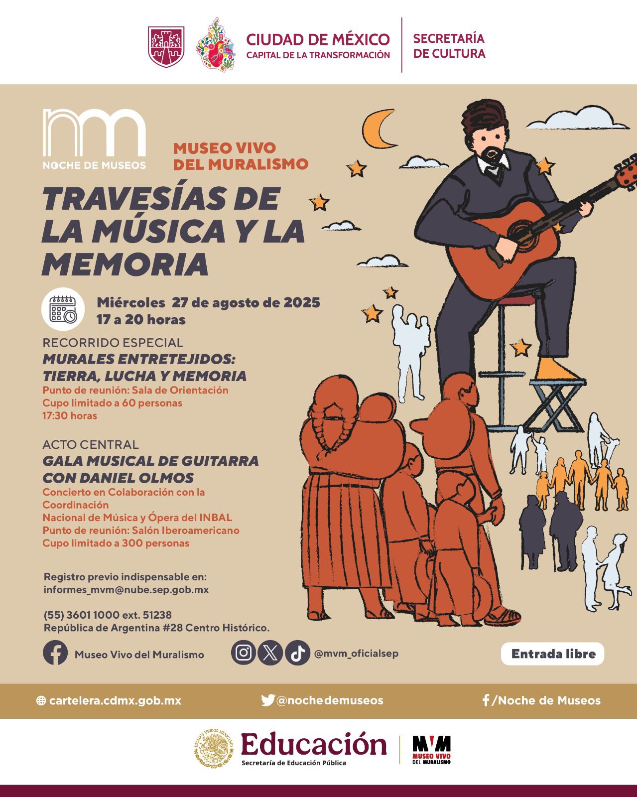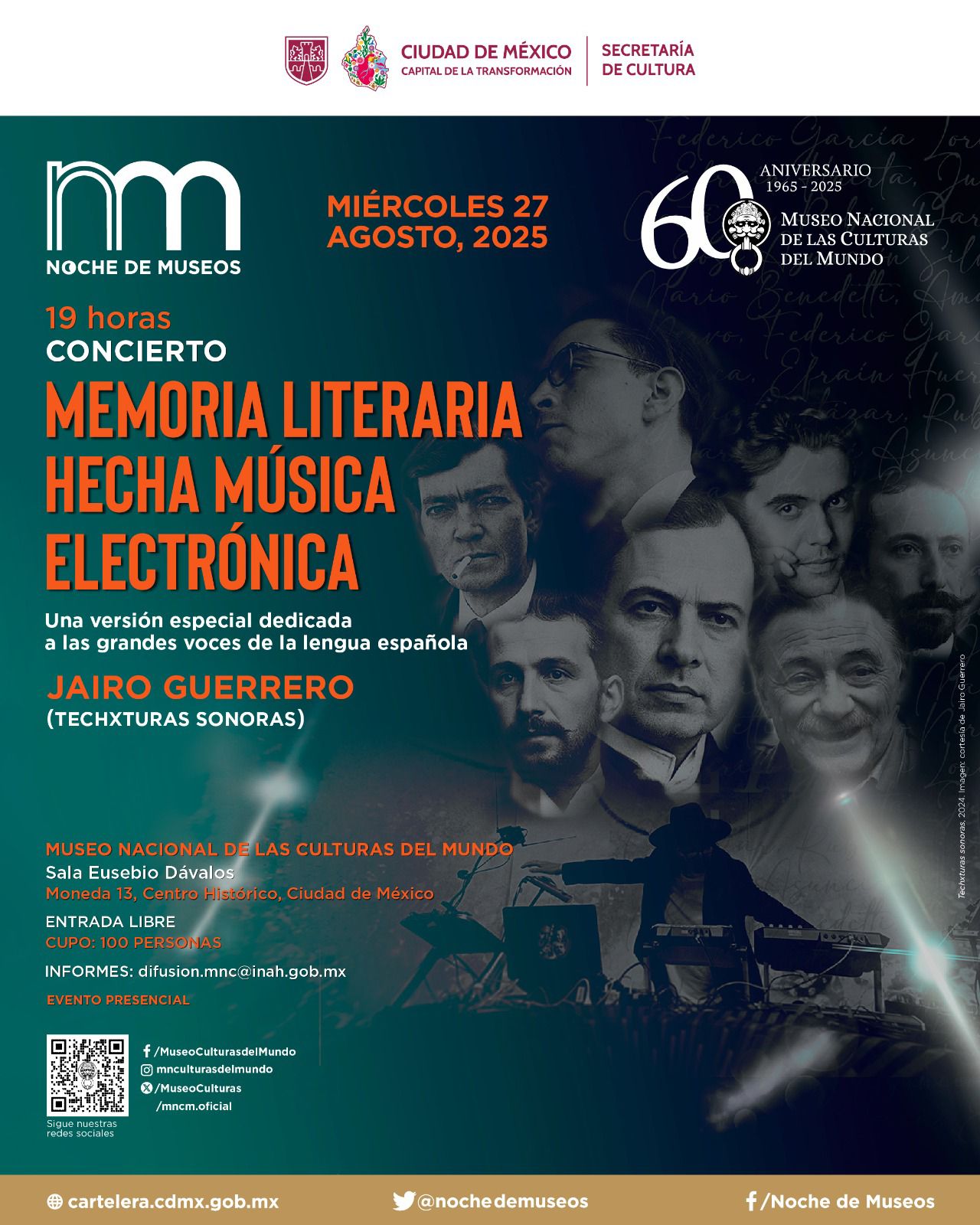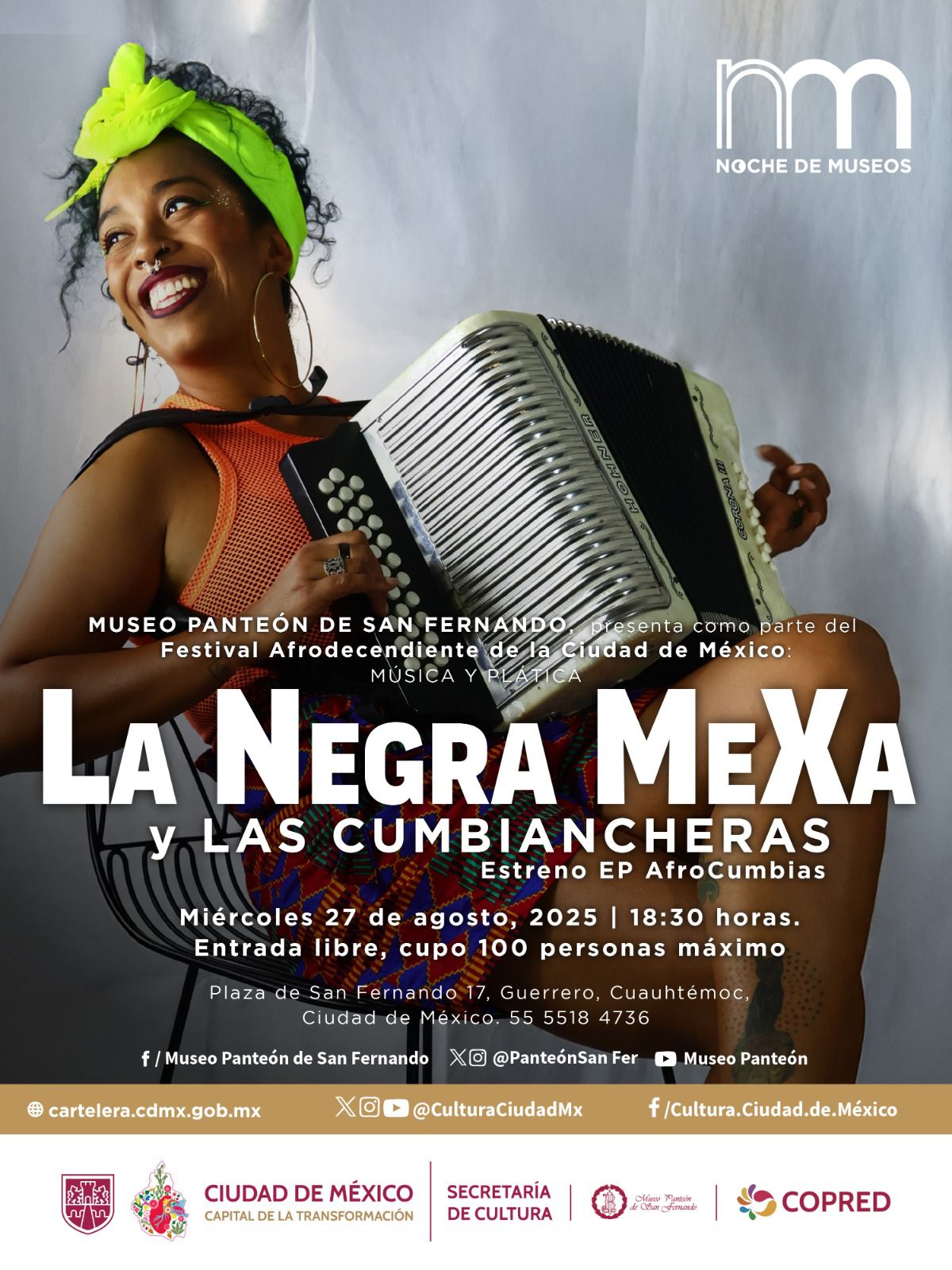 El Museo Panteón San Fernando será sede del “Festival Afrodescendencias en la Ciudad de México: Memoria histórica y resistencia” con cumbias rancheras de “La Negra Mexa y sus cumbiancheras” a las 18:30 (libre). El Museo Nacional de las Culturas del Mundo ofrece electrónica literaria con Jairo Guerrero (Techxturas Sonoras) a las 19:00 (sin costo). El Museo Mural Diego Rivera recibe al grupo OMNIBLUES desde las 18:30. El Museo Vivo del Muralismo aloja gala de guitarra con Daniel Olmos (17:00–20:00; registro: informes_mvm@nube.sep.gob.mx).