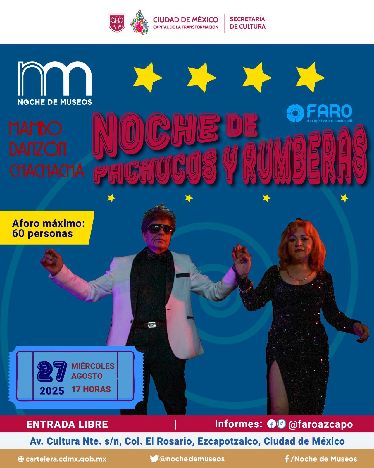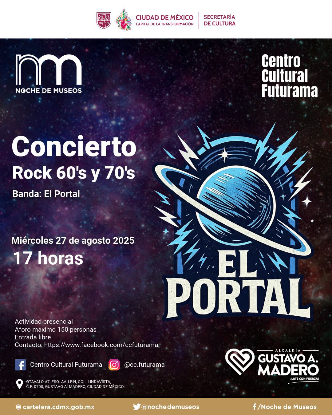 En el Centro Cultural Futurama habrá concierto retro sesentero a las 17:00 (entrada libre). La FARO Aragón proyecta “Perfume de Violetas” a las 18:00 (registro: servicios.culturales.faroaragon@gmail.com) y la FARO Azcapotzalco activa la “Noche de Pachucos y Rumberas” a las 17:00 (aforo 60). El Museo de Tequila y Mezcal Garibaldi programa recorrido y show con Gaby Casas a las 18:30 ($50) y cata de magueyes a las 18:00 ($120; mayores de edad; registro vía Facebook Garibaldi MUTEM).