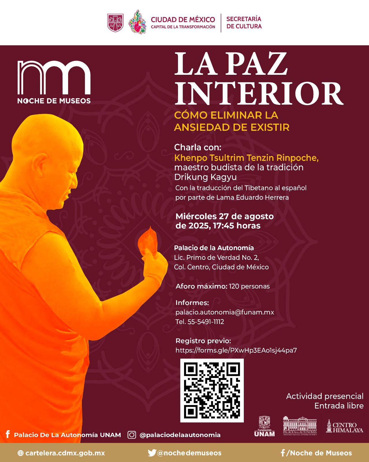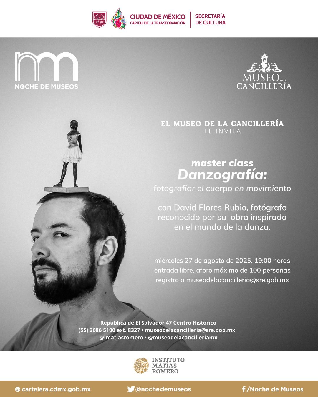 La máster class “Danzografá” en el Museo de la Cancillería enseña retrato del cuerpo en movimiento a las 19:00 (registro: museodelacancilleria@sre.gob.mx). El Centro Comunitario Ex Convento de Culhuacán ofrece visita guiada a las 18:00 y presentación musical posterior (gratuito). En el Museo Casa del Poeta habrá visita caracterizada sobre Ramón López Velarde a las 18:00 (cupo 13 personas; $20). El Planetario Luis Enrique Erro abre de 17:00 a 20:00 con observación astronómica, talleres y recorridos. El Palacio de la Autonomía prepara charla sobre herramientas para reducir ansiedad a las 17:45 (registro: palacioautonomiaunam@gmail.com).