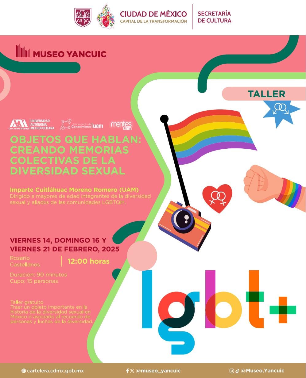 - Taller “Objetos que hablan”: Del 14 al 21 de febrero, dirigido a la comunidad LGBTIQ+ para reconstruir memorias colectivas mediante objetos simbólicos.