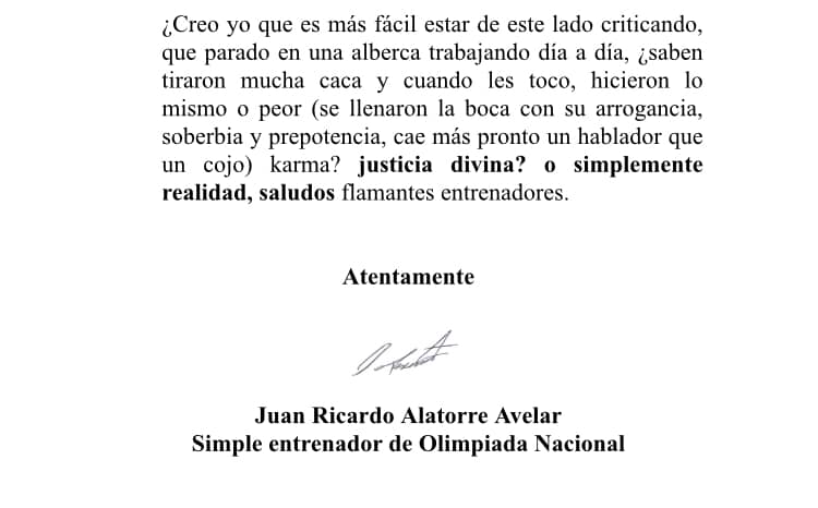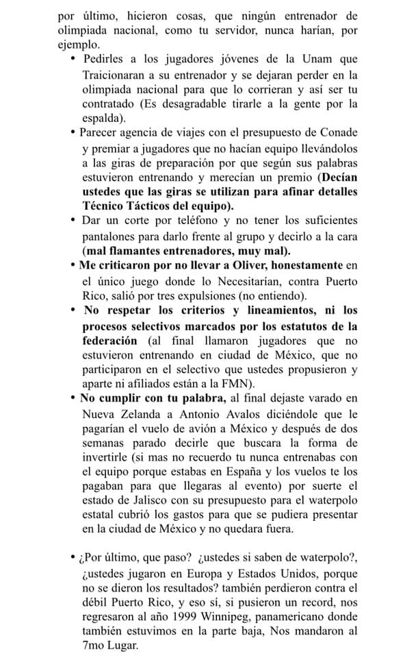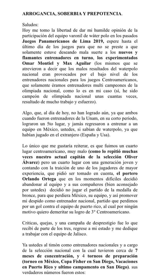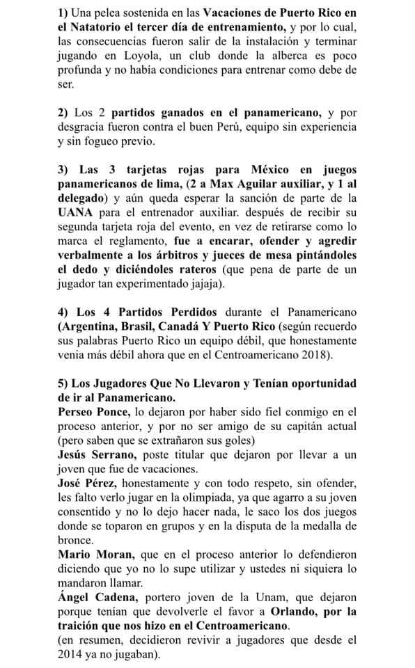 En una carta exigen la destitución de dos ex jugadores que ahora son entrenador y entrenador auxiliar, este último deberá ser sancionado por instancias internacionales debido a su mal comportamiento y lenguaje obsceno en contra de las autoridades de los Juegos Panamericanos en Polo Acuático.