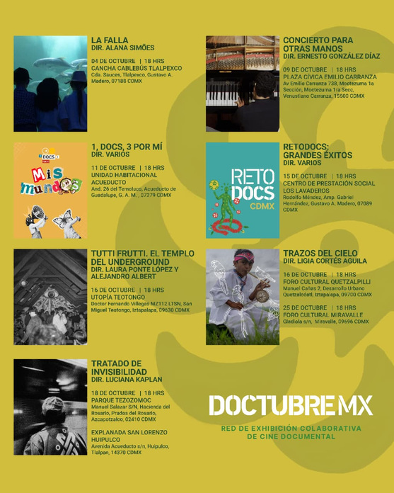 El sábado 18 de octubre, a las 18:00 horas, se exhibirá Tratado de invisibilidad, de la directora Luciana Kaplan, tanto en la explanada San Lorenzo Huipilco en Tlalpan como en el Parque Tezozómoc en Azcapotzalco. Ese mismo espíritu de cine libre y comunitario llegará a la UTOPÍA Teotongo, donde se proyectará Tutti Frutti. El templo del Underground, de Laura Ponte y Alex Albert, este jueves 16 de octubre.