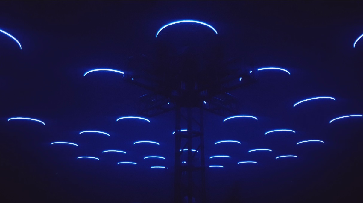 Las luces blancas de los discos en el aire hacen juego con la música y los reflectores han cambiado la iluminación a un tono celeste. Algunas personas ocupan los asientos que se han acondicionado para observar el espectáculo, otros tantos permanecemos de pie y recorremos la instalación de 45 metros de largo e incluso algunos deciden recostarse en el suelo.