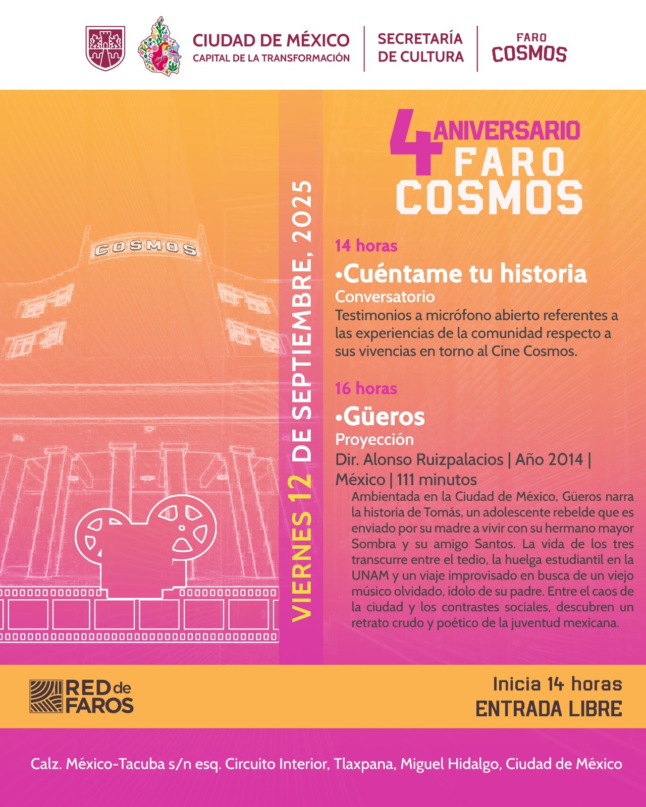 La celebración iniciará el viernes 12 de septiembre dentro del recinto con una amplia oferta que incluye la presentación de Reezzlash a las 12:00 horas, la inauguración del Caleidoscopio Cósmico, así como la apertura de la muestra fotográfica Cosmos en el tiempo. También se llevará a cabo el conversatorio “Cuéntanos tu historia”, espacio de micrófono abierto para compartir vivencias relacionadas con el Cine Cosmos. La jornada cerrará con la proyección de la película Güeros, organizada por el Cineclub Paul Leduc.