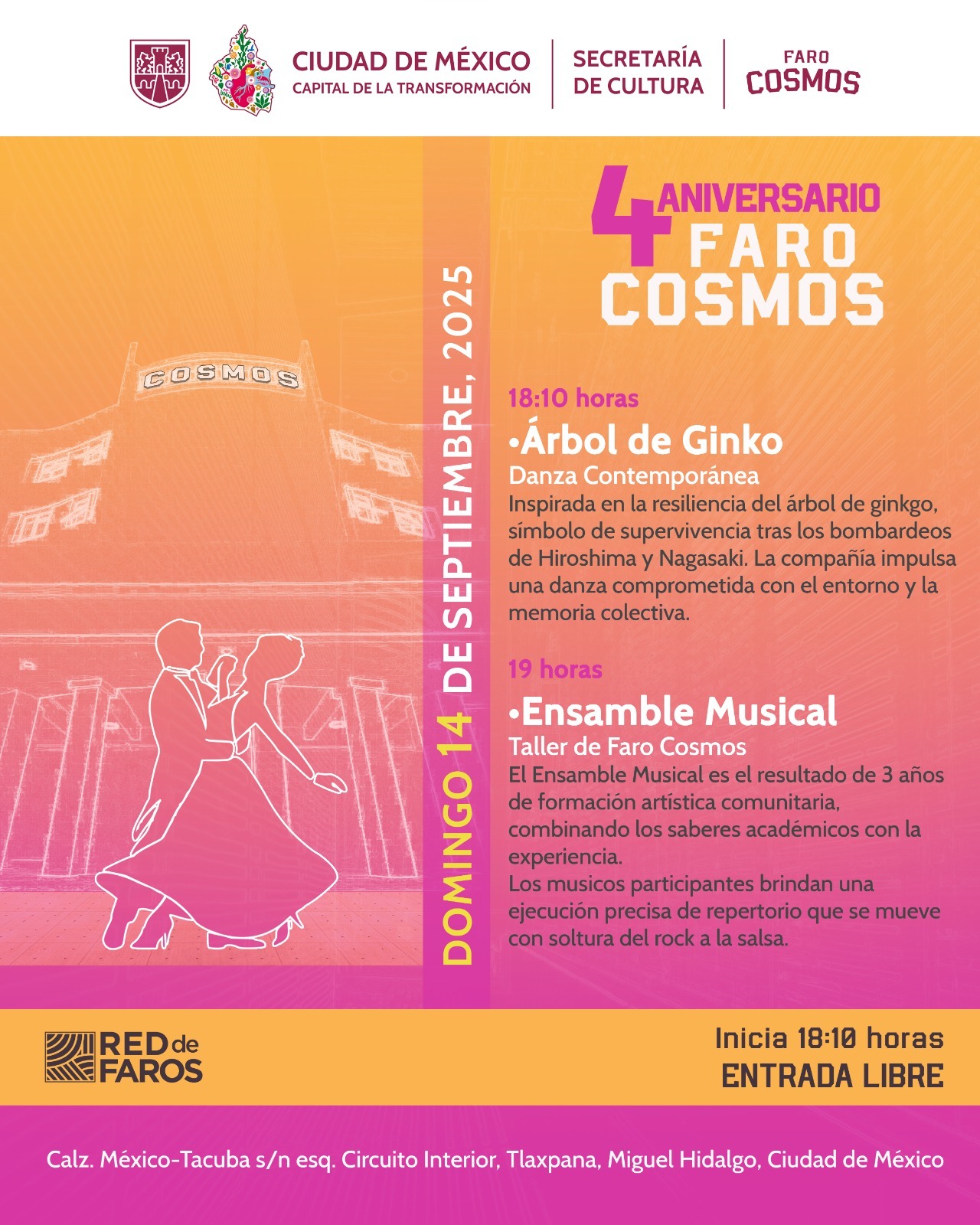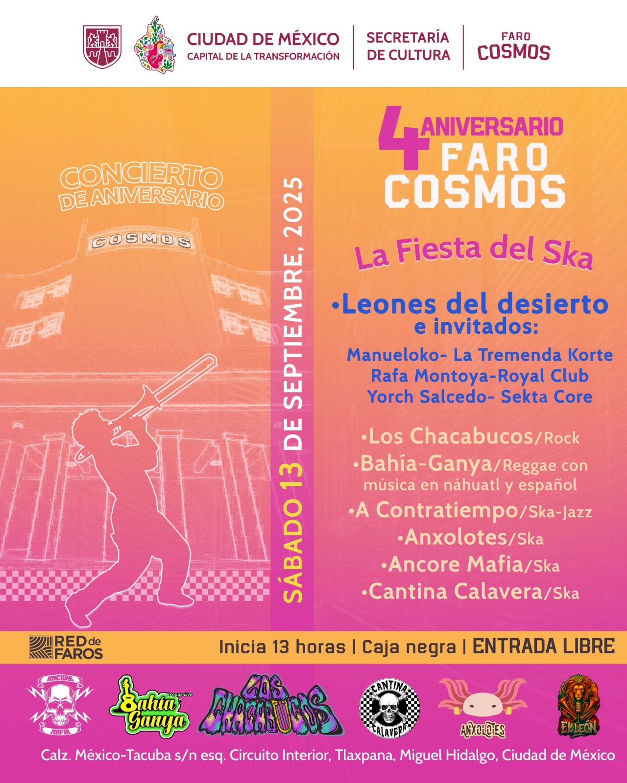 Ciudad de México.- La Secretaría de Cultura de la Ciudad de México invita a la ciudadanía a participar en las actividades conmemorativas por el cuarto aniversario de la Fábrica de Artes y Oficios (FARO) Cosmos, recinto que desde 2021 se ha consolidado como un referente cultural en la capital. Del 12 al 14 de septiembre, el espacio abrirá sus puertas con una programación gratuita que abarca presentaciones artísticas, talleres y espectáculos para toda la familia.