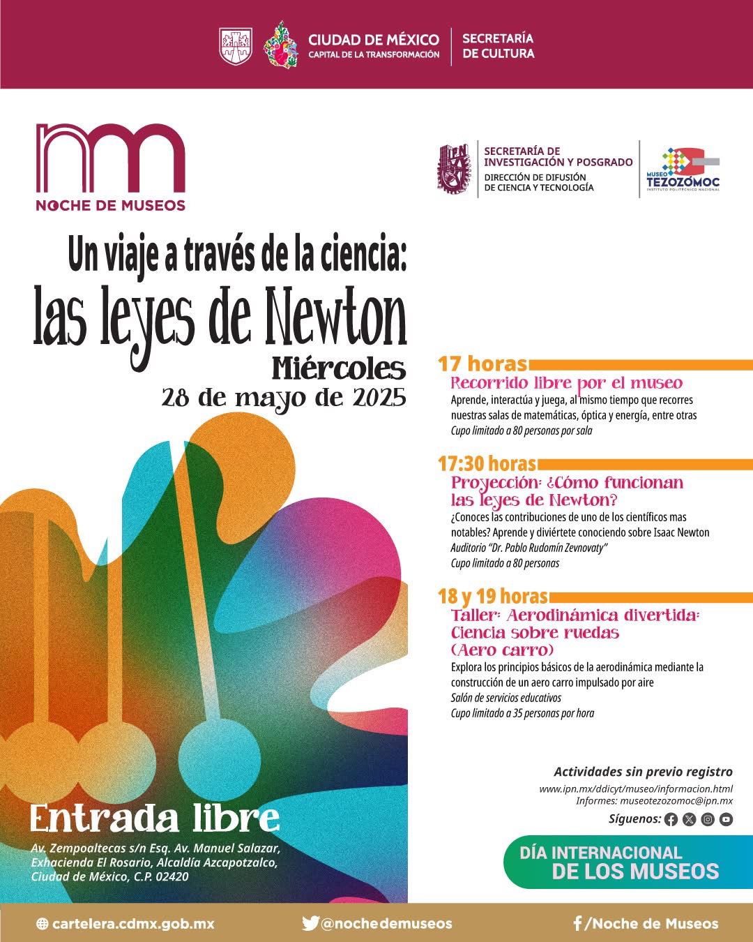 El Museo Tezozómoc tendrá una jornada especial dedicada a las leyes de Newton, con proyecciones, talleres de aerodinámica y recorridos interactivos. Por su parte, el Foro Valparaíso realizará un recorrido y charla con interpretación en Lengua de Señas Mexicanas. La Red de FAROS también participa con actividades musicales y lingüísticas, destacando el náhuatl en la FARO Azcapotzalco.