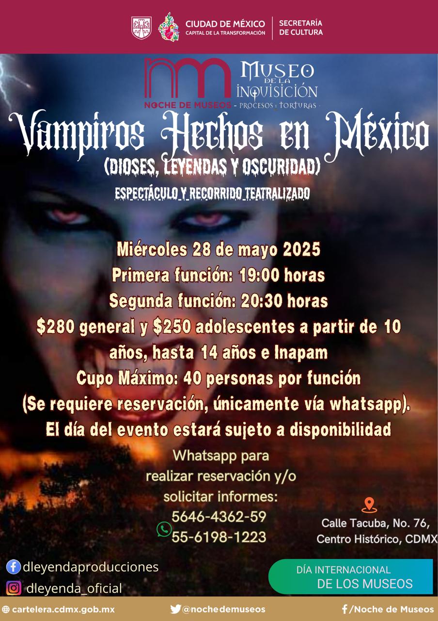 El Museo Nacional de Historia, Castillo de Chapultepec recibirá a los visitantes con recorridos guiados por exteriores, una charla histórica en su auditorio y una narración musical en el patio de eventos. El Museo de la Inquisición ofrecerá dos funciones del espectáculo “Vampiros Hechos en México”, mientras que el Museo del Tequila y Mezcal tendrá cupo limitado para su taller, que conecta con las raíces culturales mexicanas.