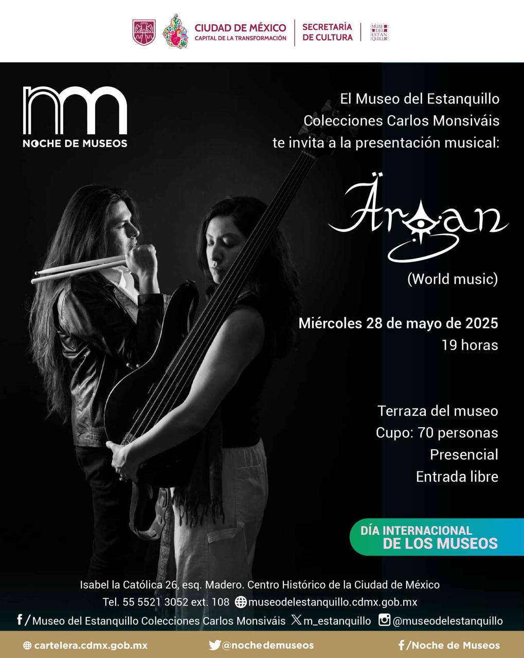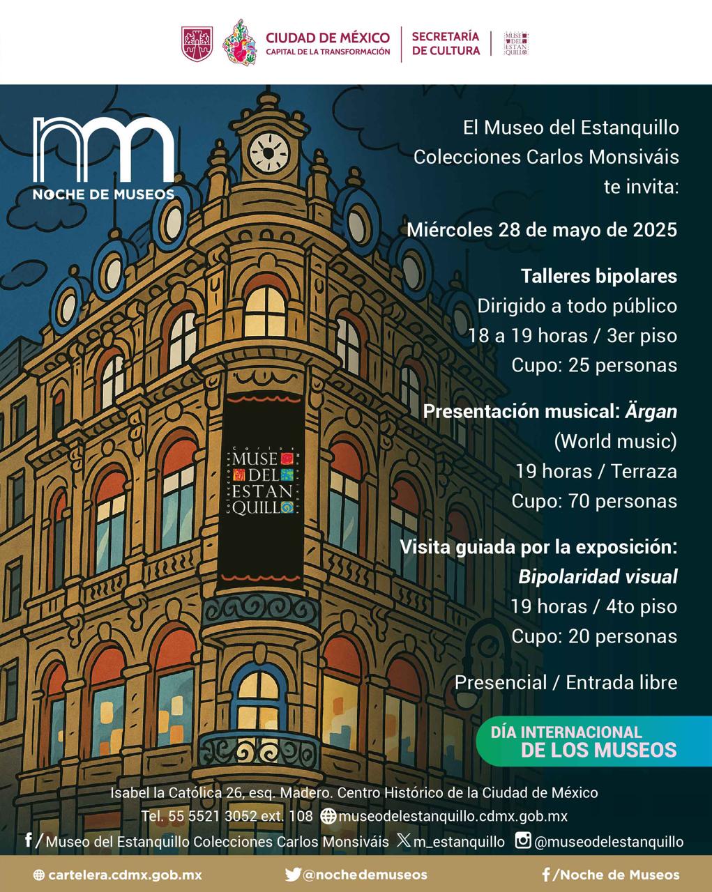 El Museo del Estanquillo celebrará el Día Internacional de los Museos con talleres y una presentación musical de Ärgan en su terraza, además de una visita guiada por la exposición “Bipolaridad Visual”. El Centro de la Imagen programó una visita guiada por su exposición “La mirada esencial. 100 años de Leica y su conexión con Latinoamérica”, mientras que el Centro Comunitario Ex Convento de Culhuacán ofrecerá un recorrido histórico, lectura de cartas y un concierto íntimo.