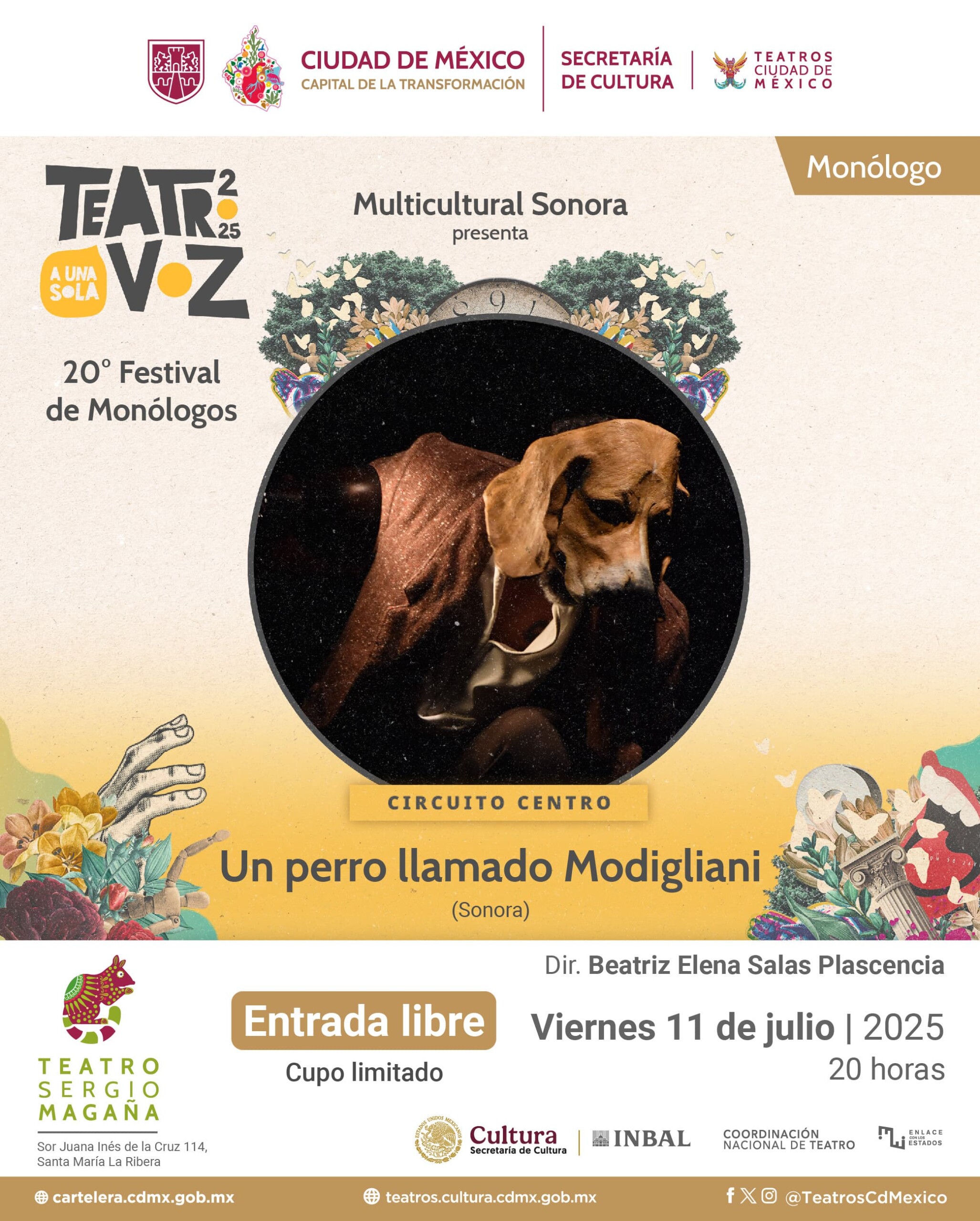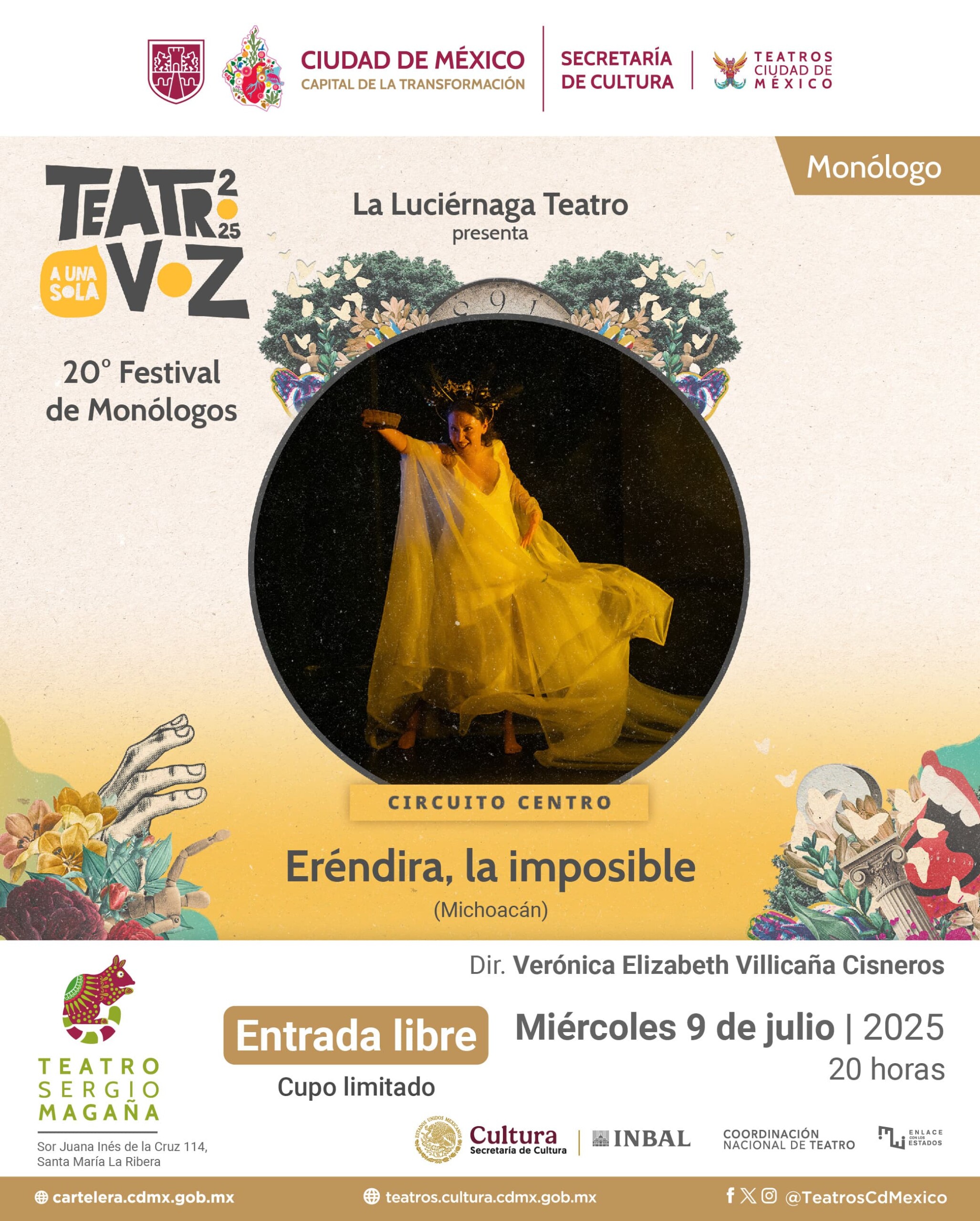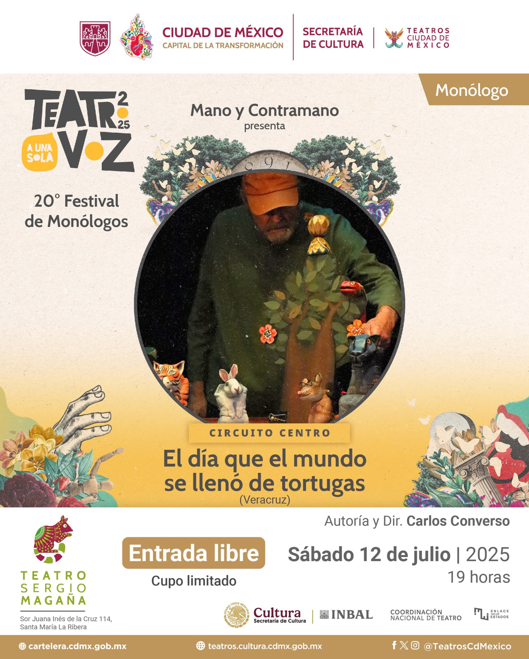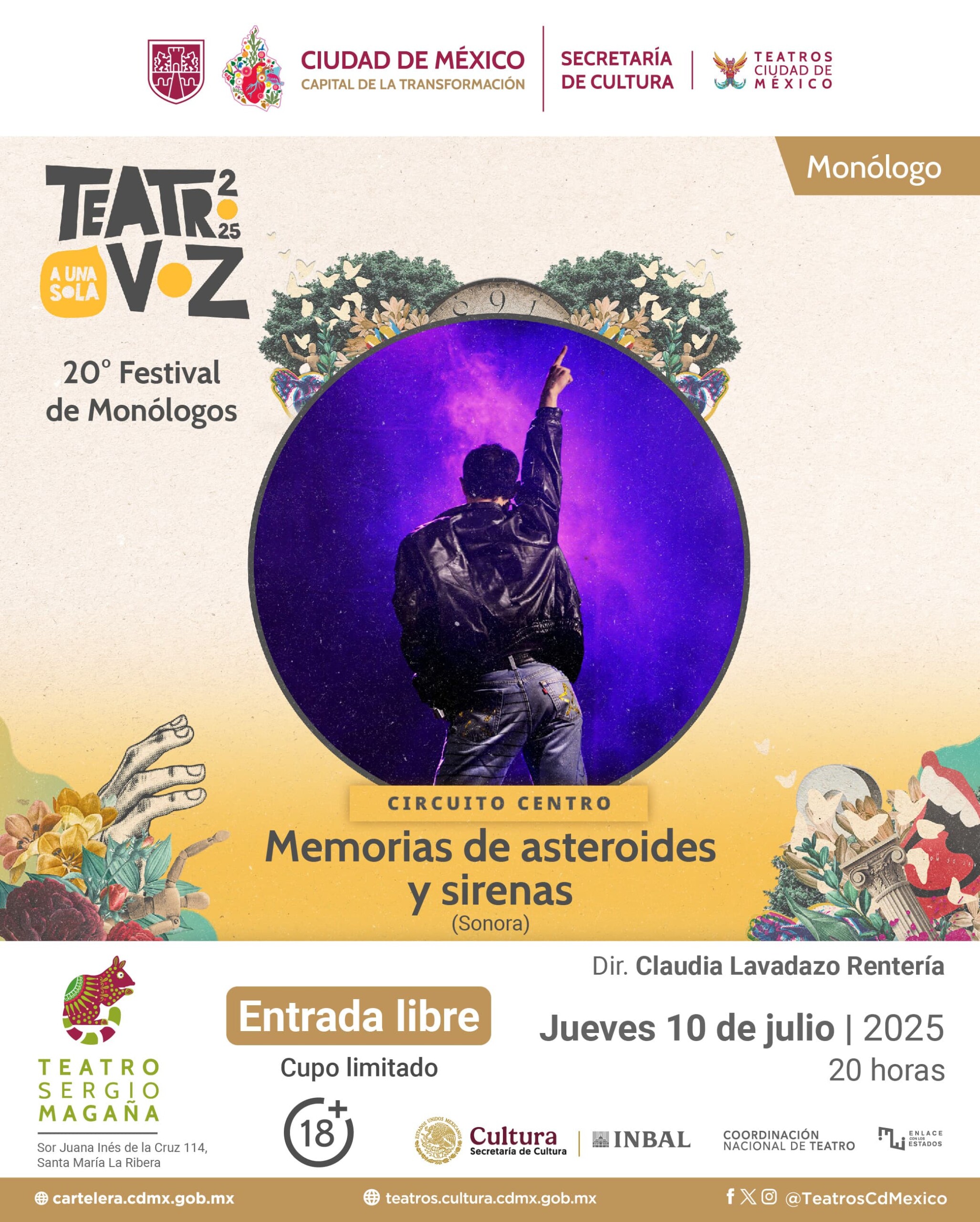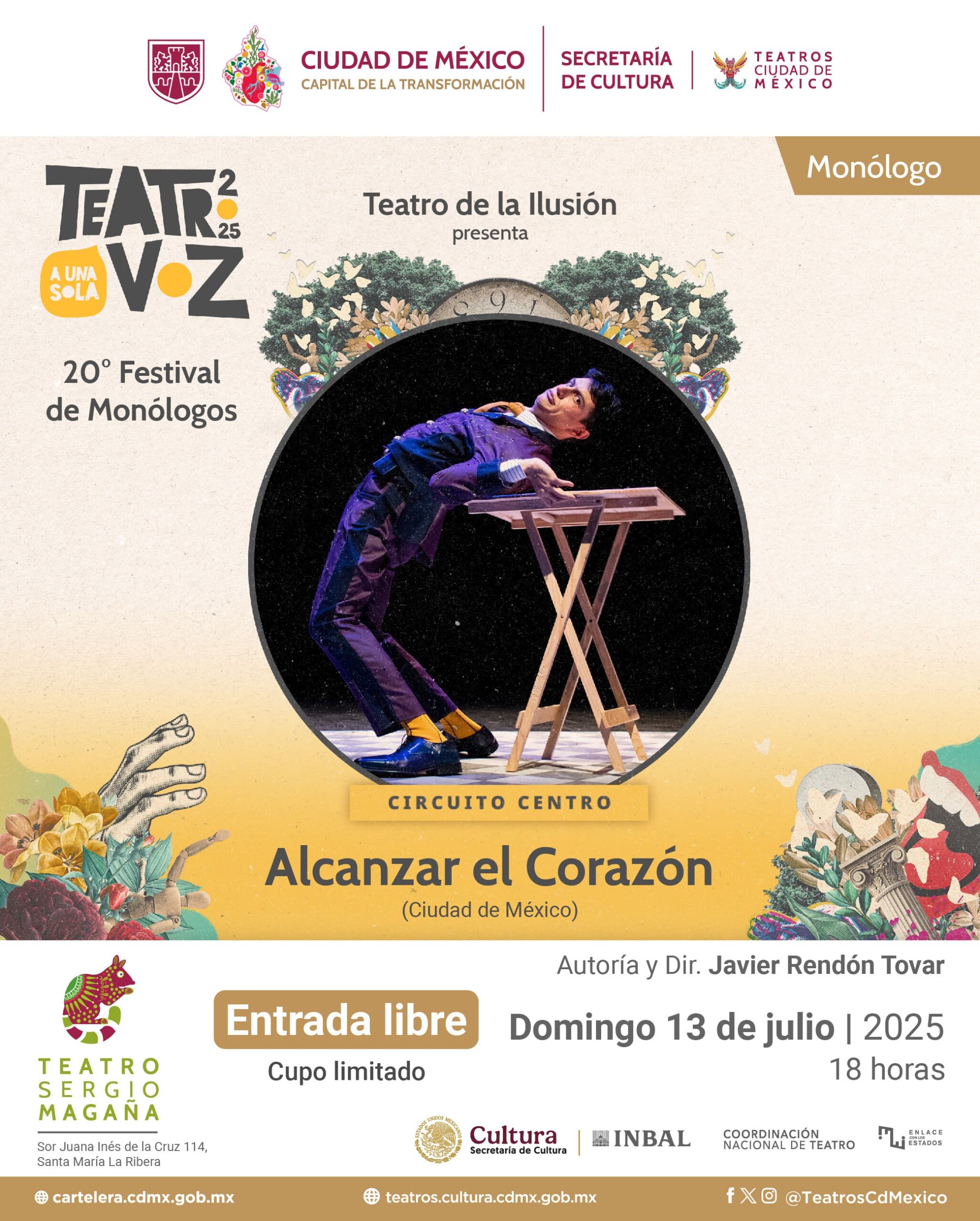 Ciudad de México.- El Teatro Sergio Magaña, perteneciente a la Secretaría de Cultura de la Ciudad de México, albergará la vigésima edición del festival Teatro a Una Sola Voz, una celebración dedicada al monólogo escénico. Impulsado también por el INBAL, la Coordinación Nacional de Teatro y la Secretaría de Cultura Federal, este evento busca fortalecer la presencia del unipersonal, promoviendo su consolidación, desarrollo y proyección. Las funciones se llevarán a cabo del martes 8 al lunes 14 de julio, con entrada gratuita y cupo limitado.